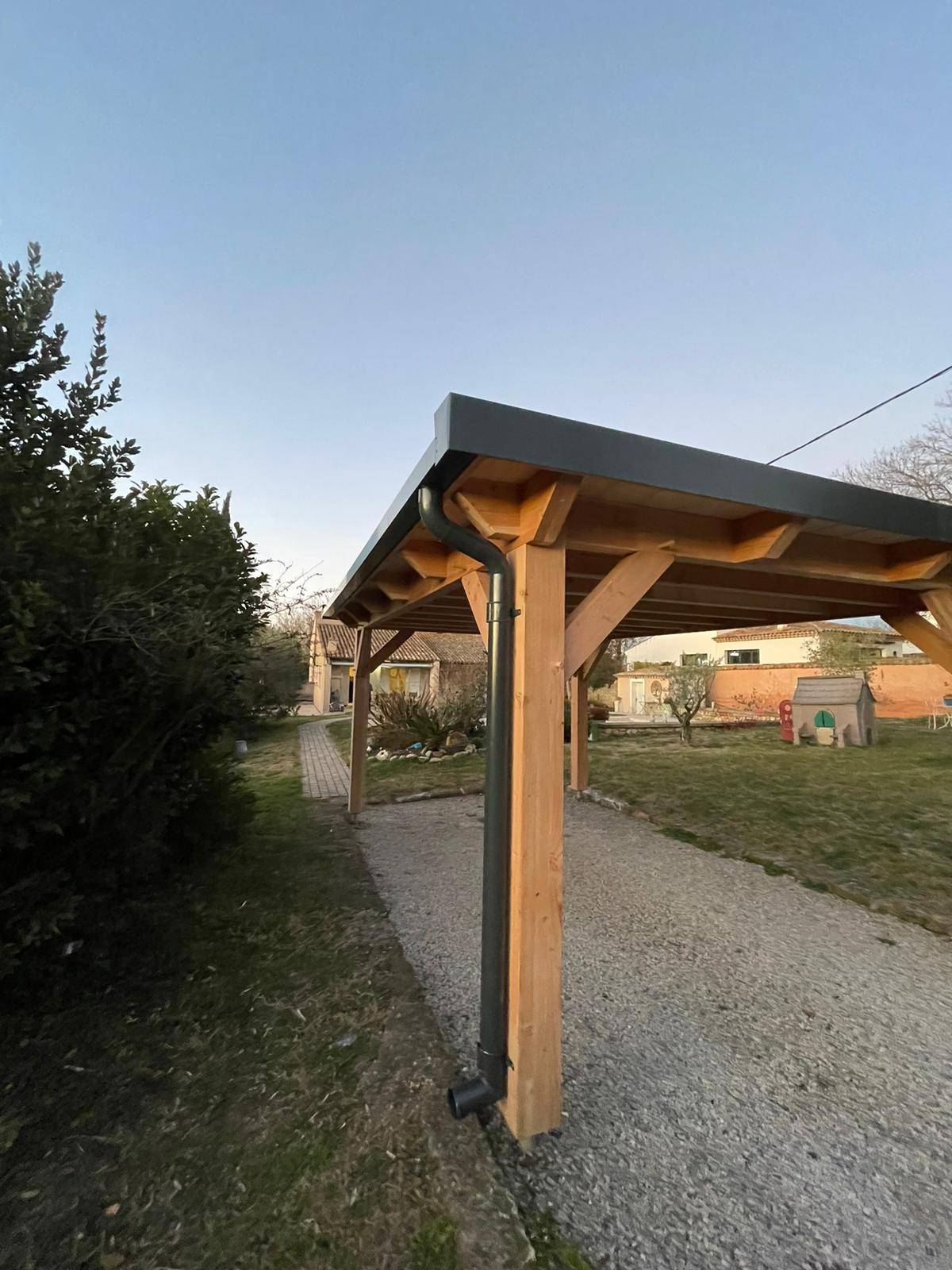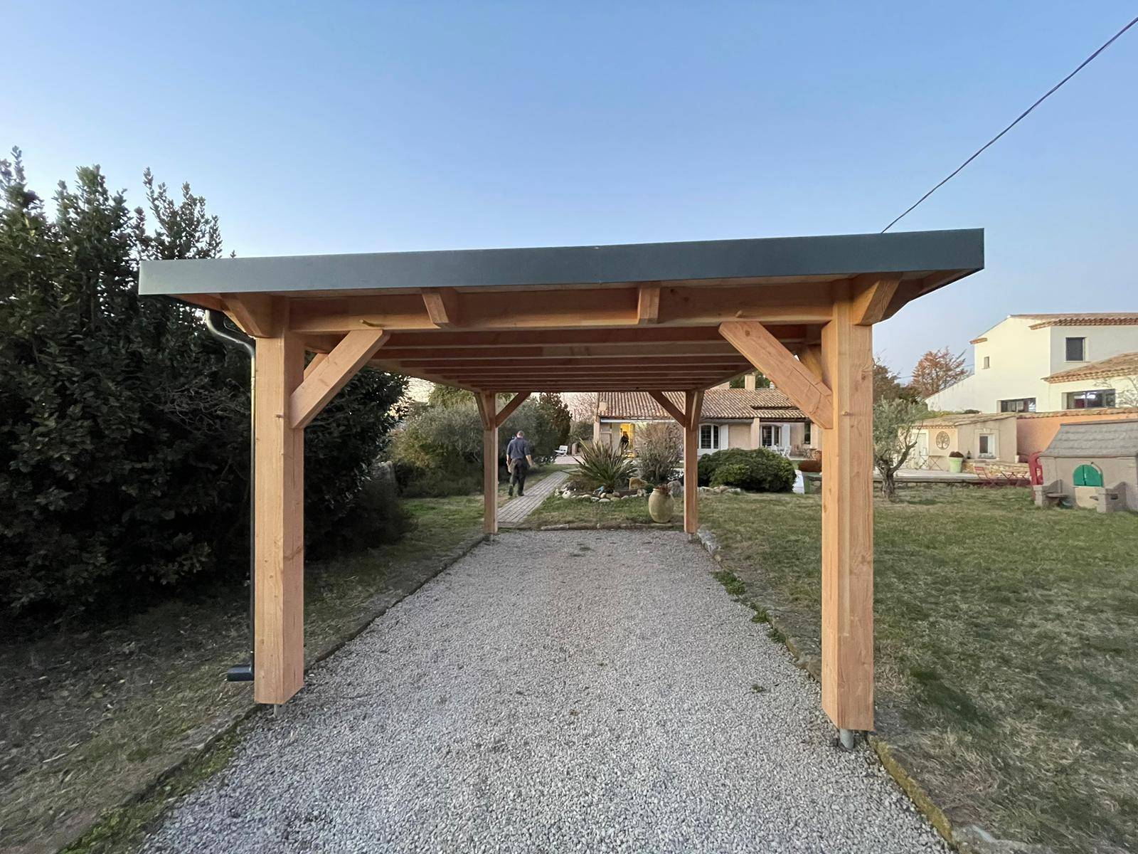 Récemment, un de nos clients à Beauvoisin a fait réaliser par nos soins un abri voiture en bois avec toit plat. Conçu sur mesure, cet abri voiture s’intègre parfaitement à l’environnement de la maison, offrant une structure robuste et durable, tout en apportant une touche contemporaine à son extérieur.