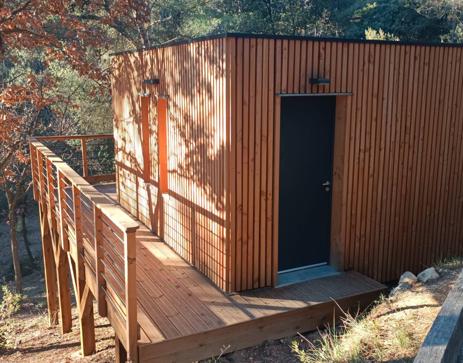 fabrication d’aménagements en bois sur mesure, notre client a opté pour un modèle en hauteur pour s’intégrer parfaitement à son environnement boisé et offrir un beau point de vue sur la beauté végétale alentour.