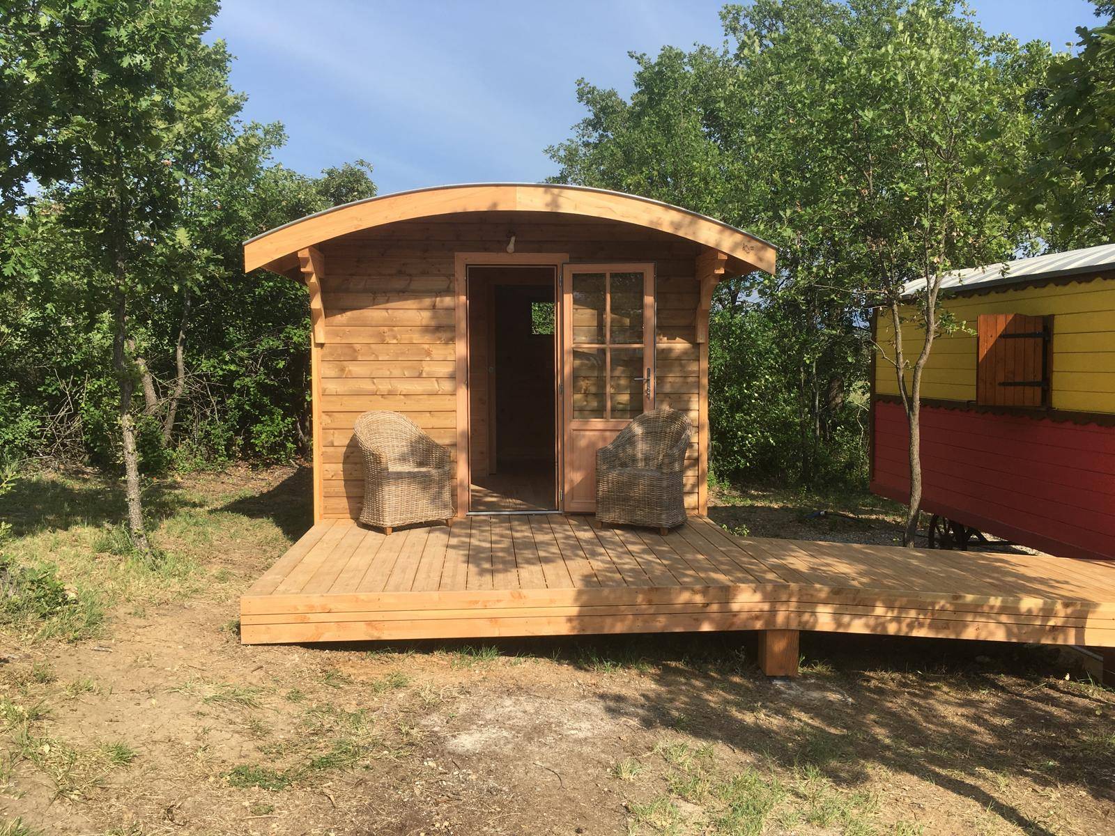 Réalisation d'un logement insolite sur la commune de Gargas. Dimension extérieur murs : 4x3 m conception: - Fourniture et pose d'une couverture en zinc. Structure du toit en madrier, toiture de forme cintrée. avec en suivant la réalisation d'une Terrasse bois extérieur en lame douglas lisse soit 12 M2 Ensemble des bois naturel.